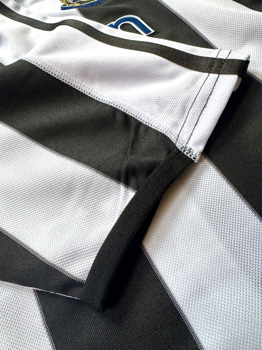 ¡Encarna el sueño de Santiago Muñez con esta auténtica camiseta retro del Newcastle United de la película GOAL! Esta icónica playera a rayas blancas y negras, con el escudo tradicional bordado, es la misma que vistió el personaje en su llegada triunfal a la Premier League inglesa.